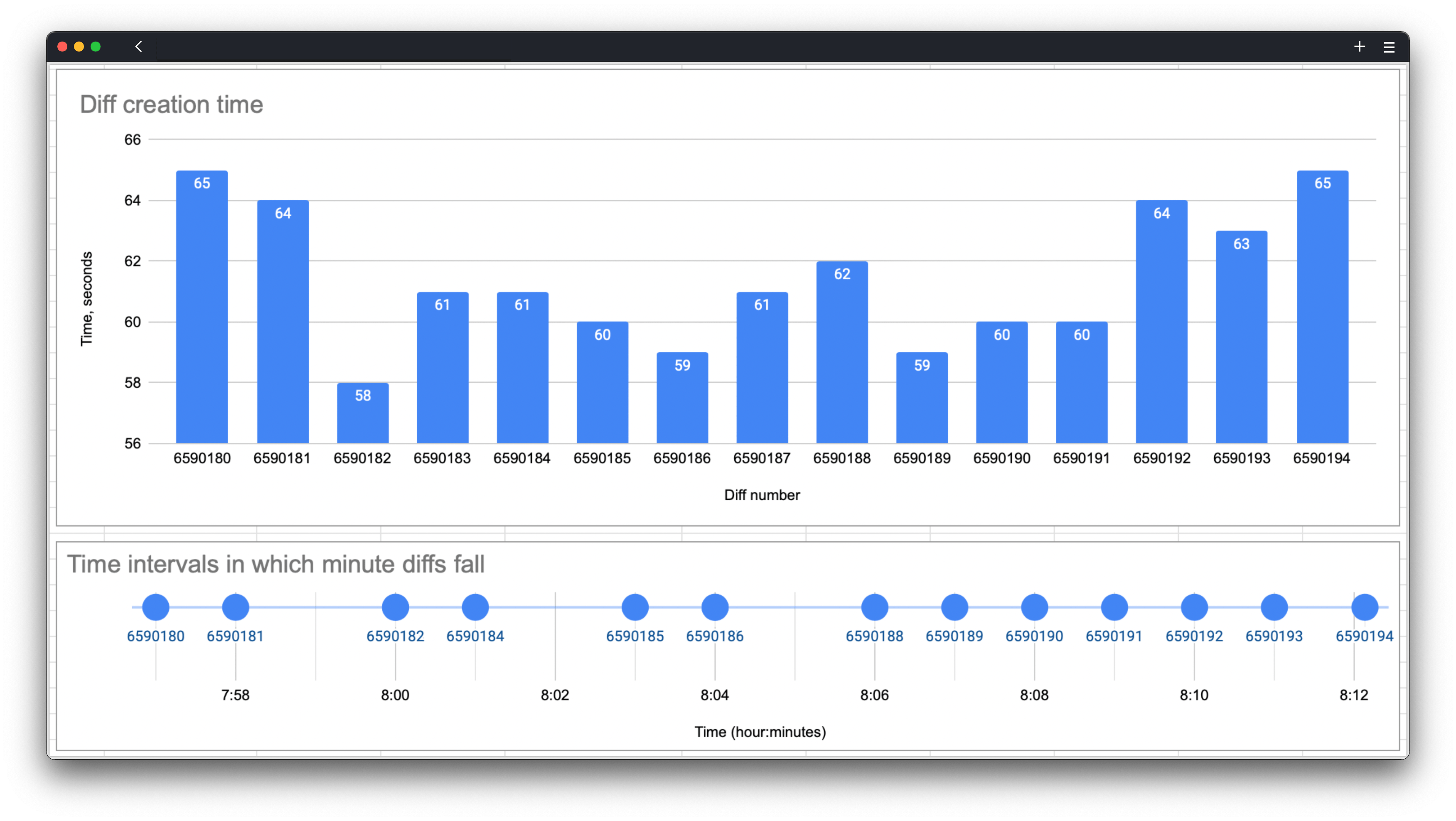 On the charts, you can see how long it took to generate each minute diff and which minutes they were created in. You can observe that at 7:59, 8:02, and 8:05 no diffs were created — slippage occurred.