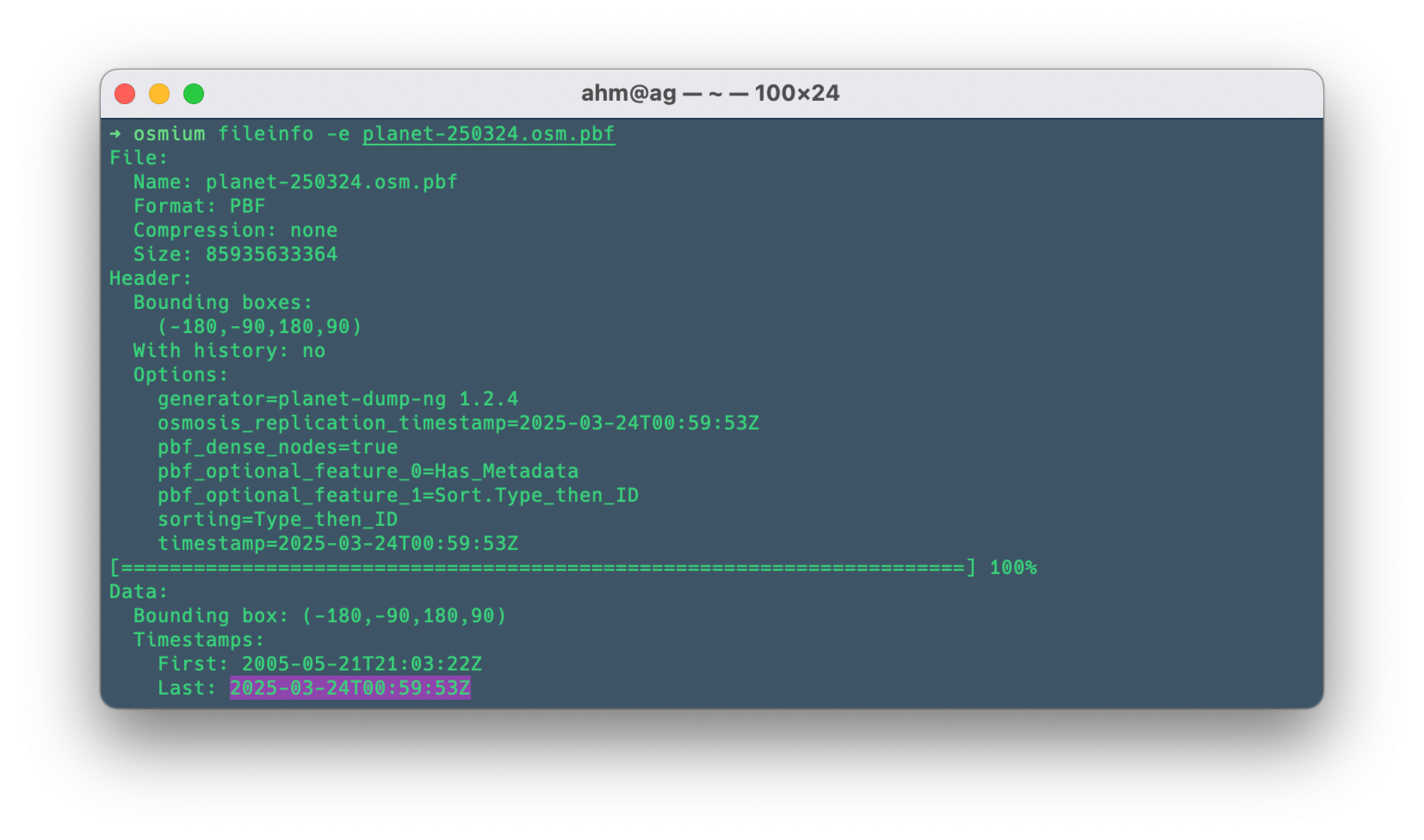 To synchronize your local data with the current OpenStreetMap data, you need to determine the last timestamp present in your local dump. For example, in a dump dated March 24, 2025, the last timestamp was 2025-03-24T00:59:53Z.